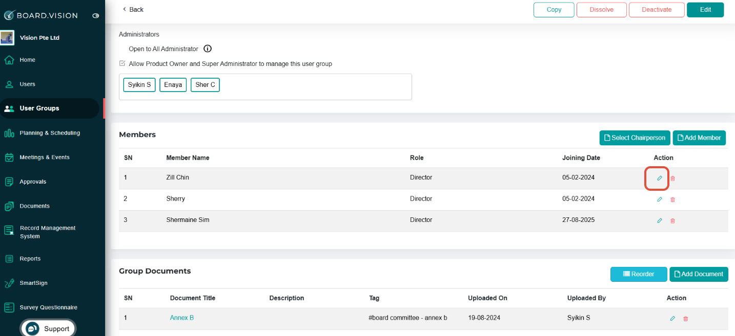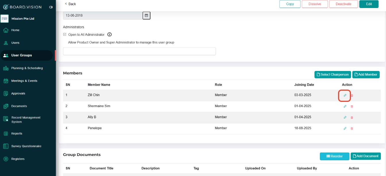 3) In the View User Group page, scroll down to "Members" and click on the Pen icon corresponding to the member's name.