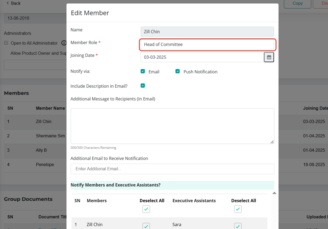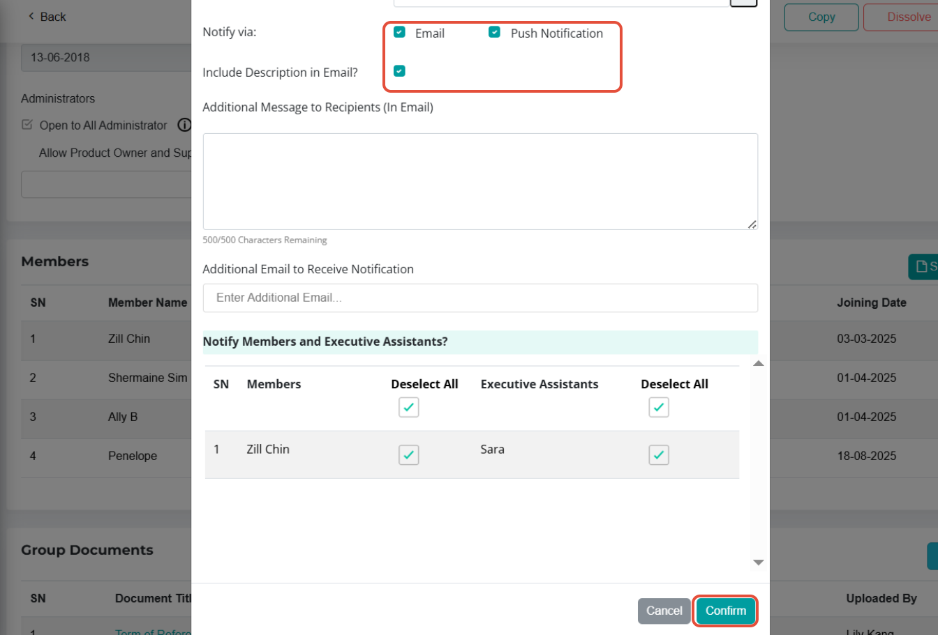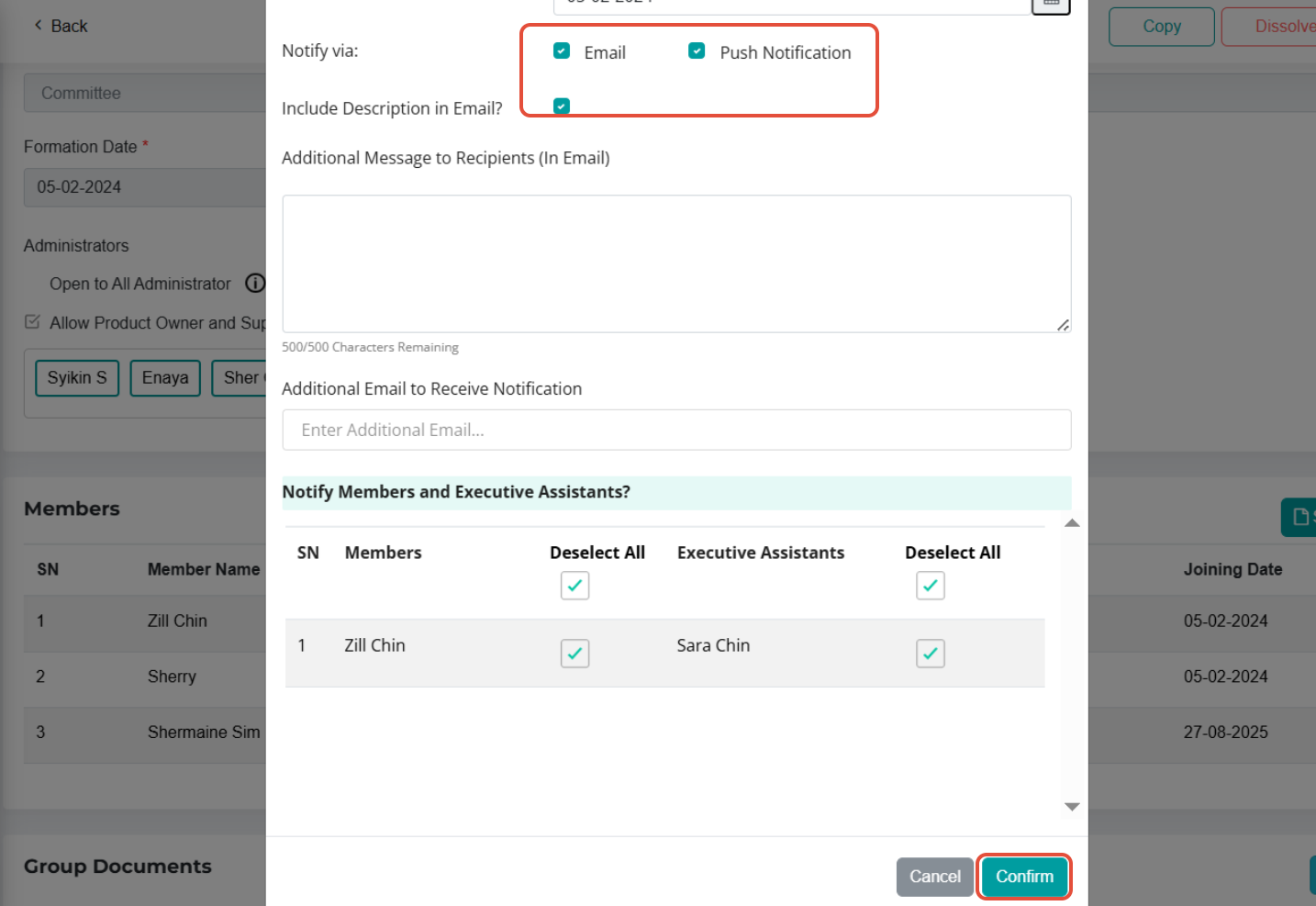 b) Under the Notify Members & Executive Assistants section, choose the Business User and his/her PAs if you wish to notify them.