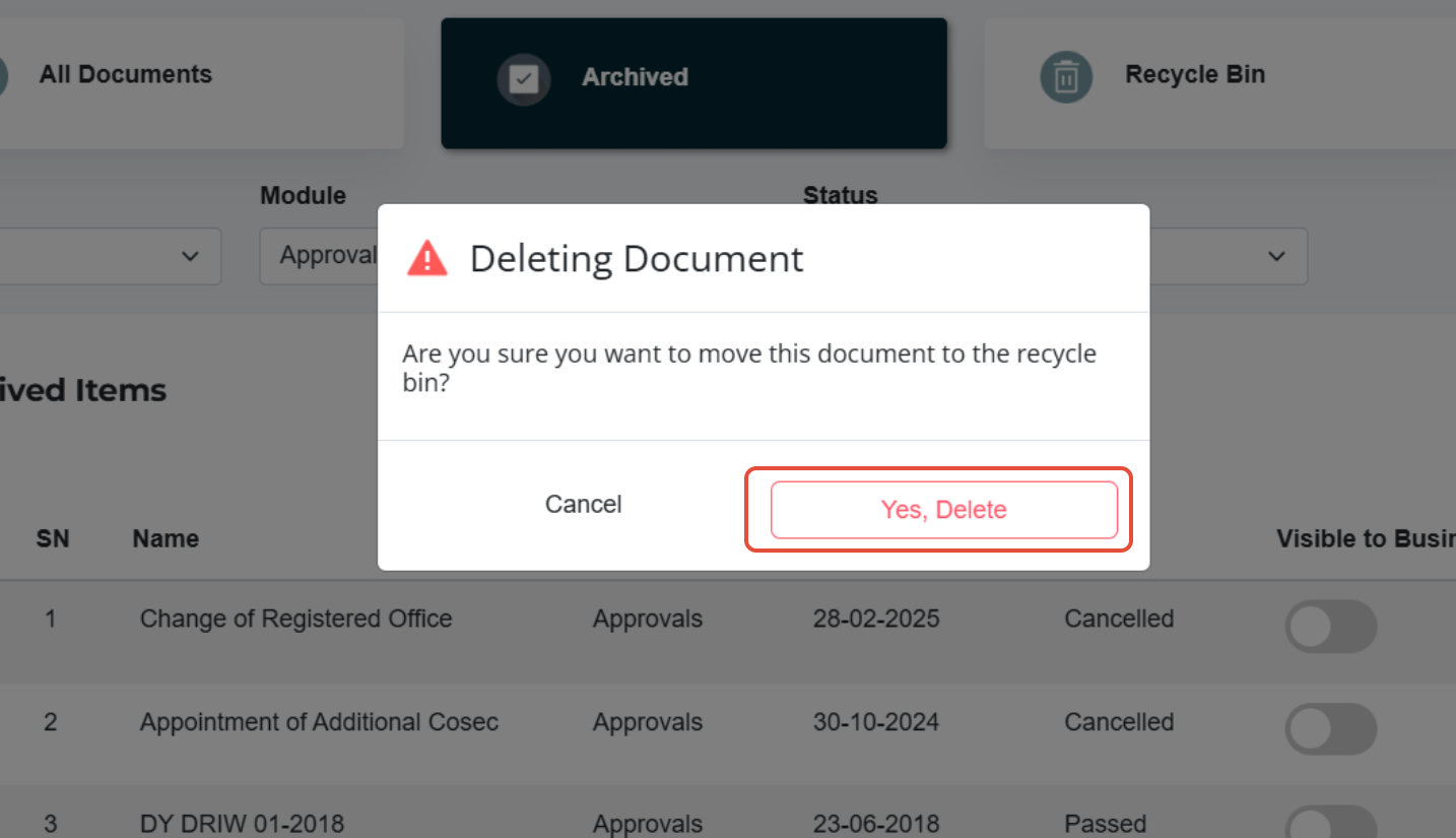 4) On the Deleting Document pop-up window, click on Yes, Delete.
