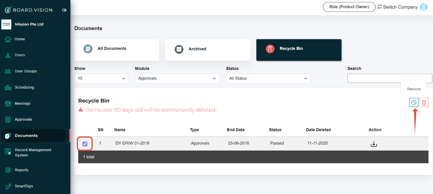 Important Note: Items stored in the Recycle Bin for more than 90 days will be permanently deleted.