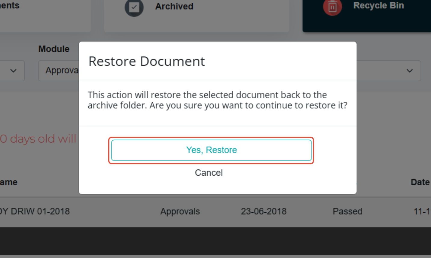 2) On the Restore Document pop-up window, click on Yes, Restore.