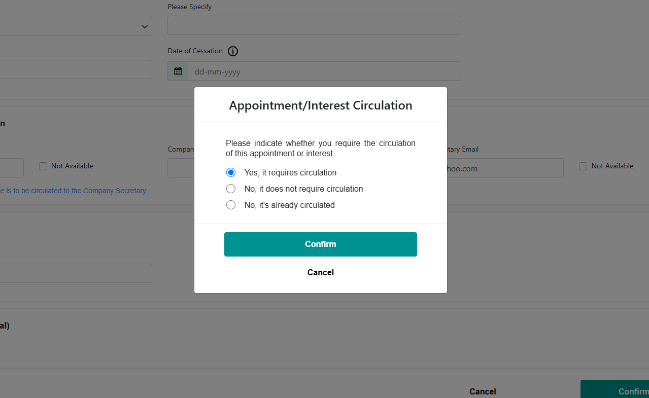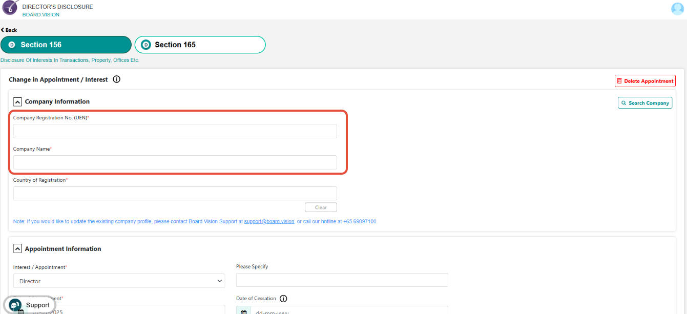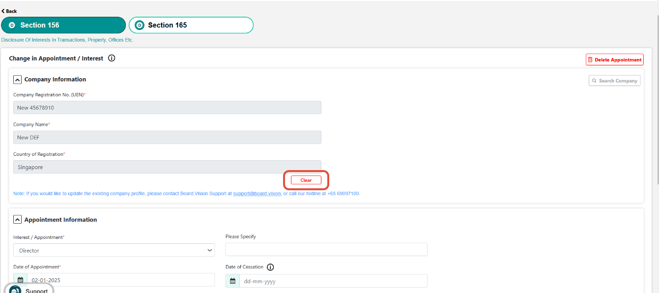 Changes to appointments/interests with the source "Board.Vision" cannot be made directly in Section 156. These details are pre-populated from the Board.Vision Register module. If any modifications are needed, please contact the Company Secretary, who will initiate the necessary changes through the Board.Vision portal.