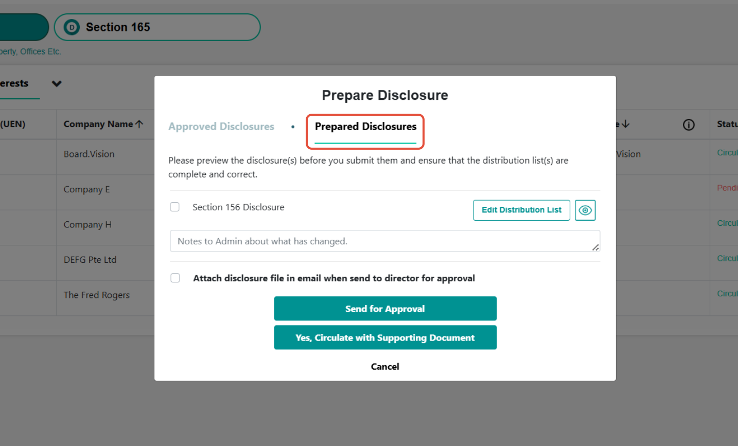 In Board.Vision Director's Disclosure, Directors can circulate their own disclosures directly. In this tutorial, we will walk you through the steps to notify a Director to circulate a disclosure after you have entered his/her directorship appointments on their behalf.