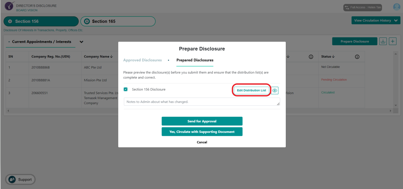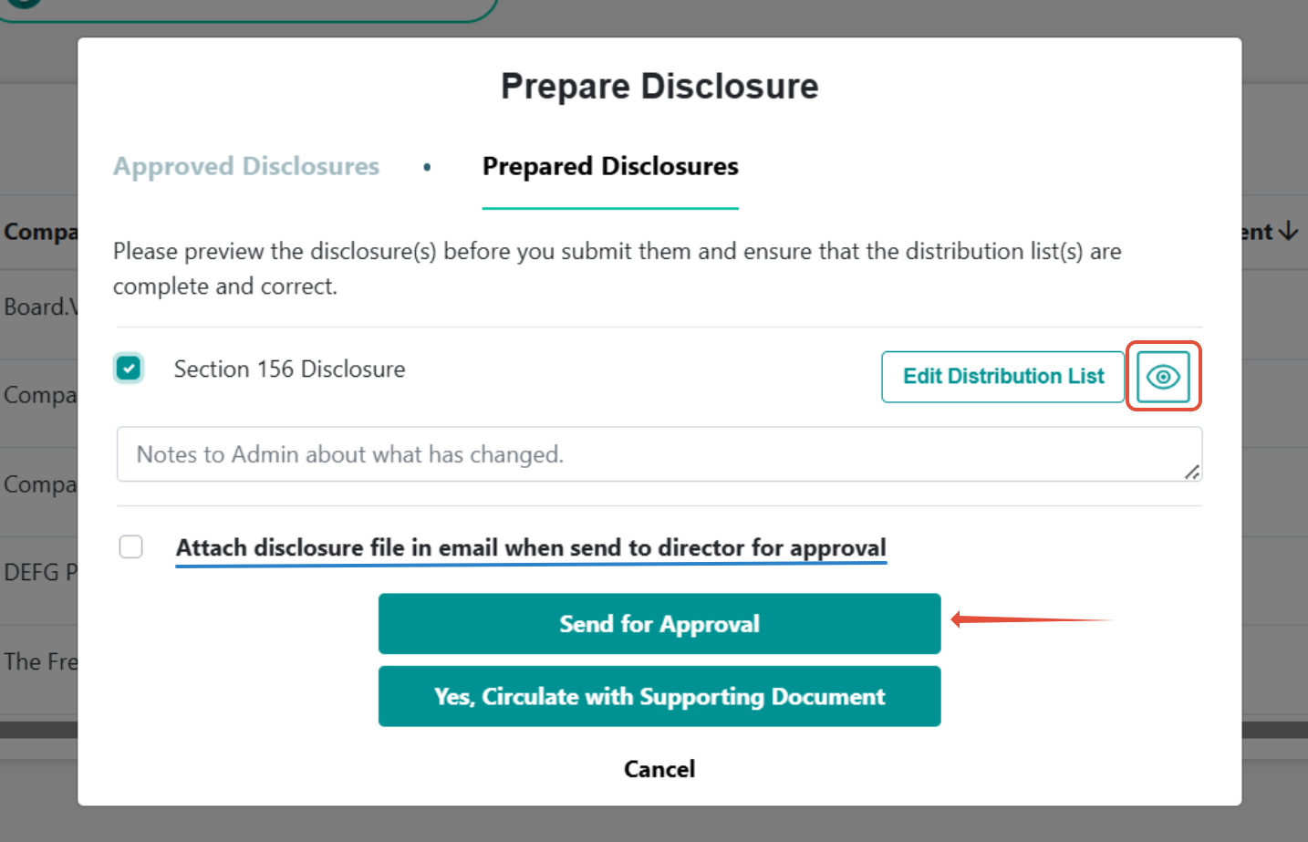 10) If you would like to preview your Director’s disclosure again, click the Eye icon located next to the Edit Distribution List button. Once confirmed, click on Send for Approval to proceed.