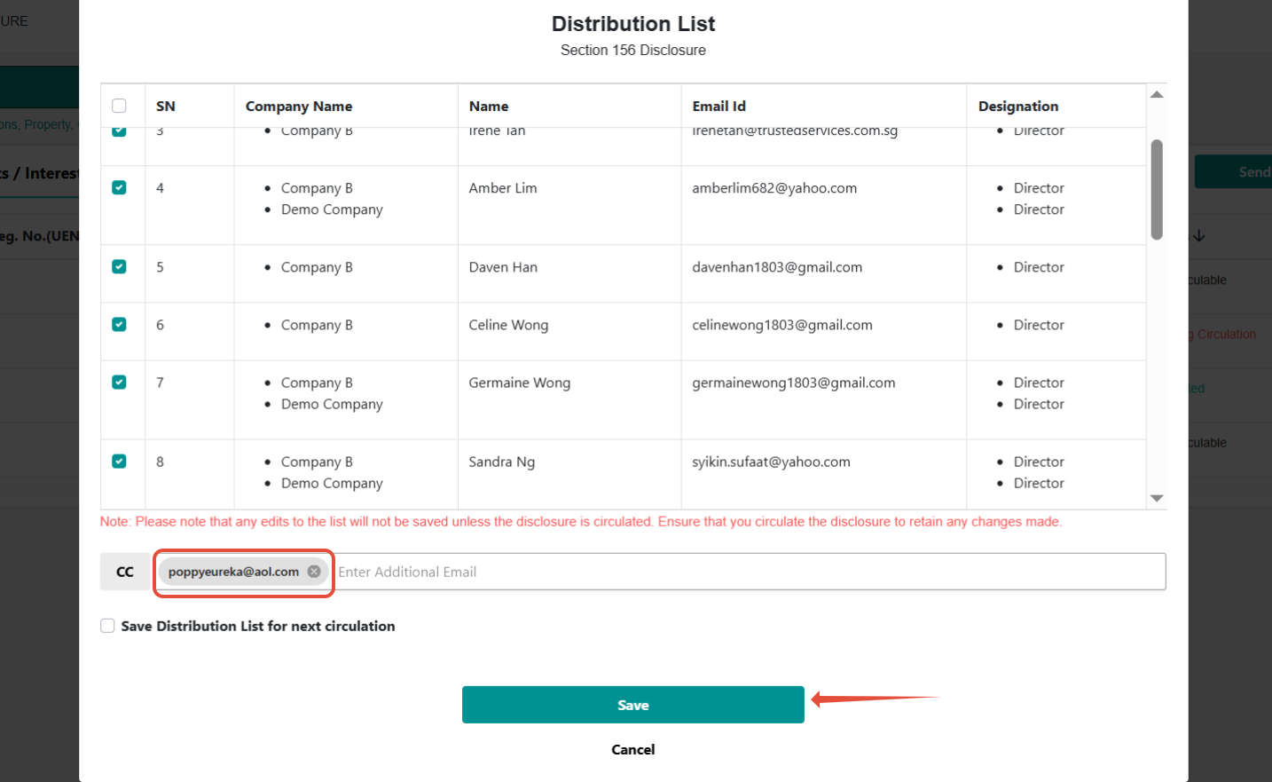 9) If you need to send the disclosure to recipients outside of the distribution list, enter their email addresses in the CC field. To save any changes made to the distribution list, click Save.