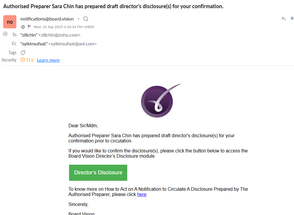 Your Director will receive an email notification from Board.Vision <notifications@board.vision> with a title, “Authorised Preparer <Preparer’s Name> has prepared draft director’s disclosure(s) for your confirmation.”