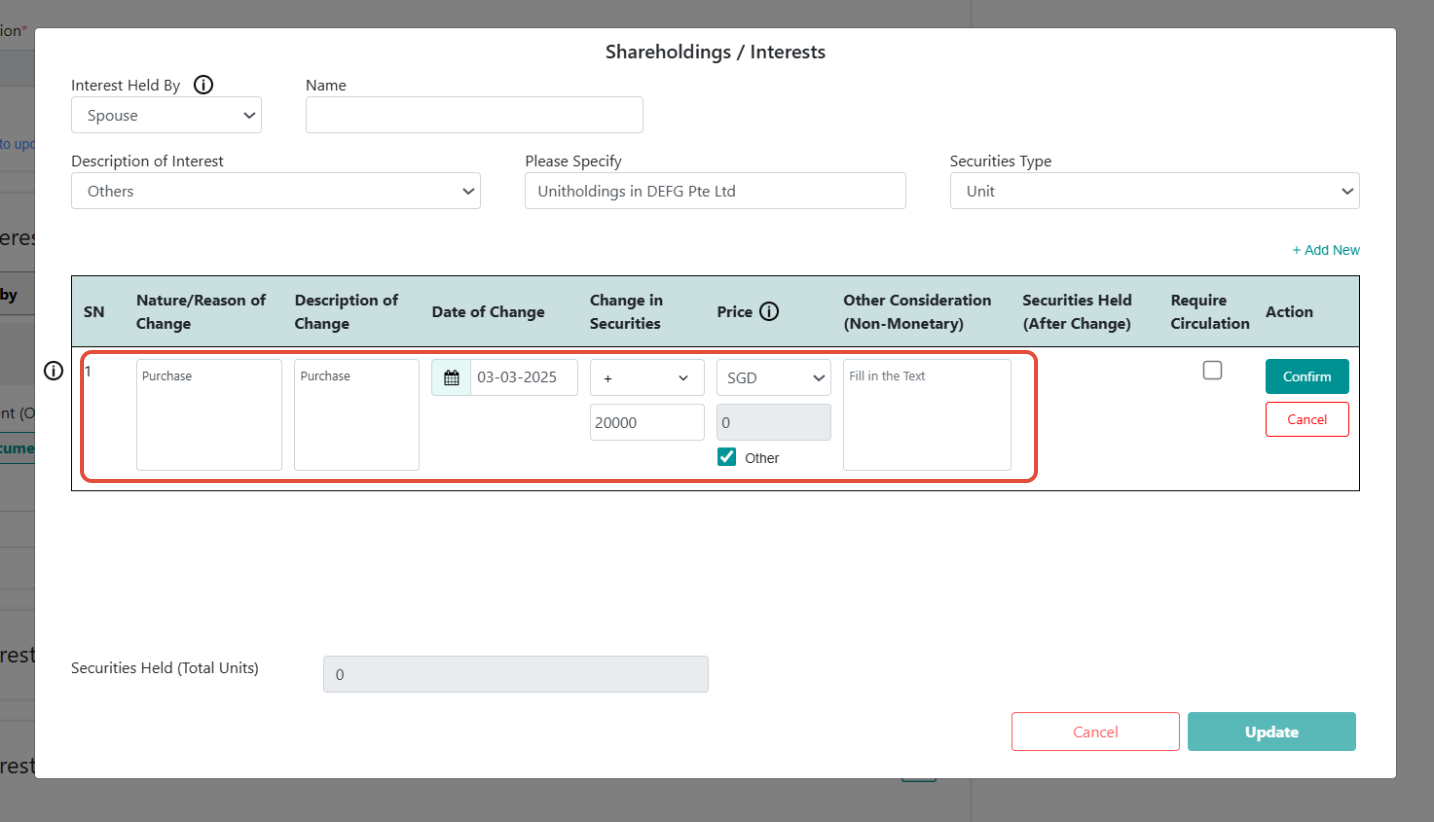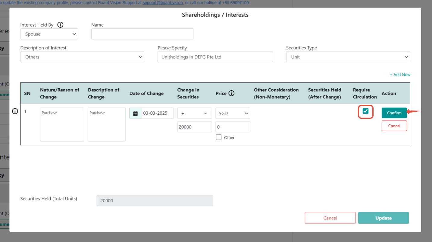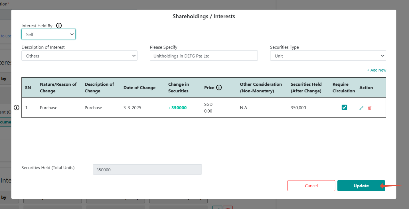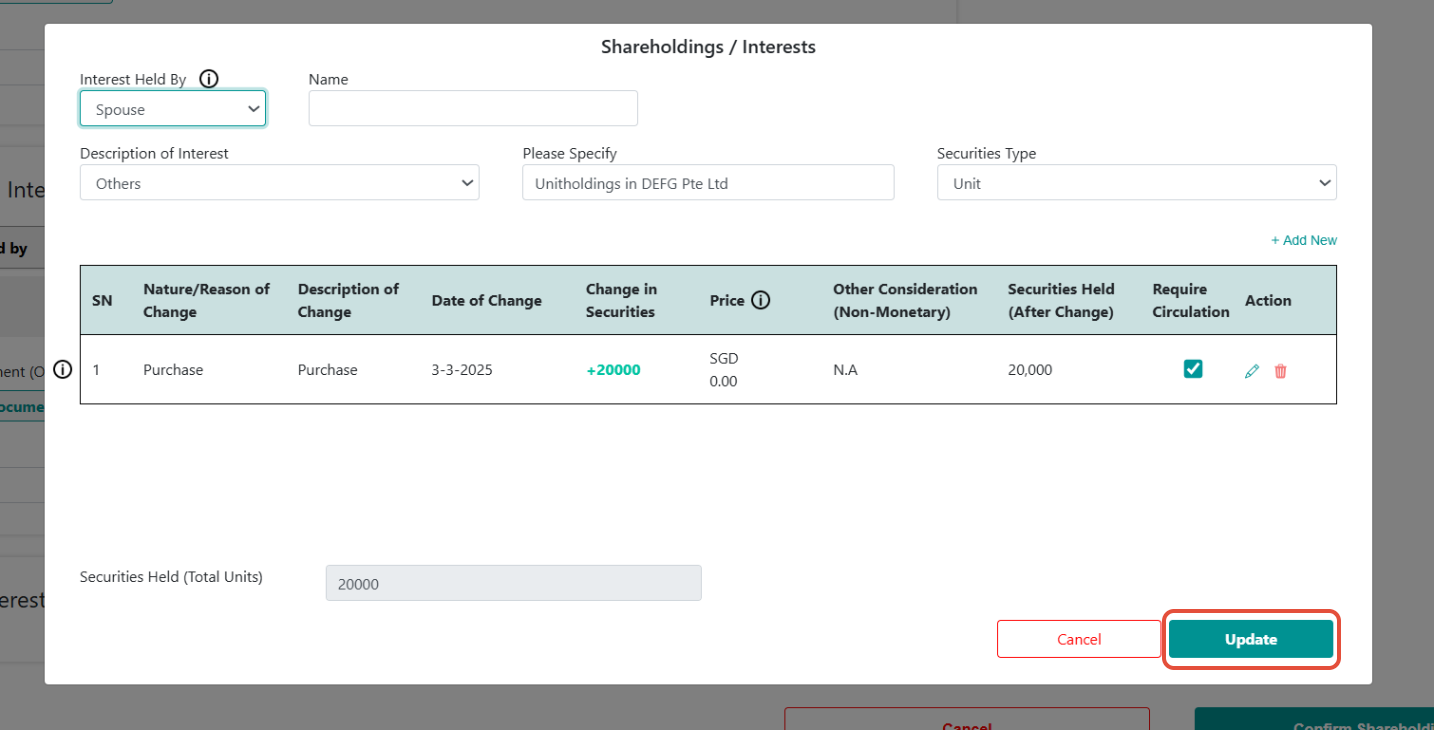 Note: Circulation is typically required when the shareholding or interest is newly acquired and needs to be disclosed to the company for transparency and compliance with the Singapore Companies Act 1967.