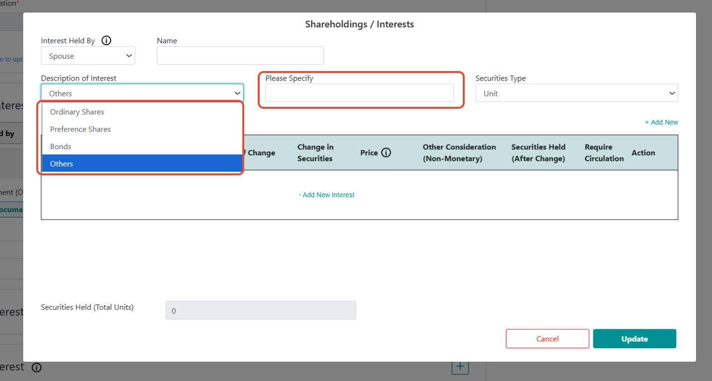 8) Select Ordinary Shares, Preference Shares, Bonds or Others from the "Description of Interest" dropdown menu.