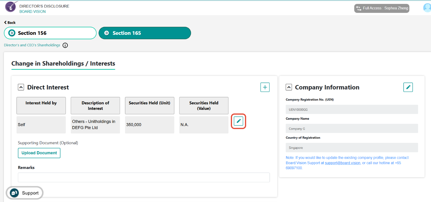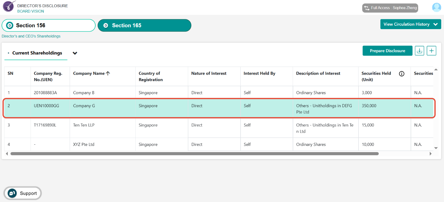 4) Go to Section 165 to proceed to the Current Shareholdings section. Then, click on the Shareholding / Interest you would like to make changes to.