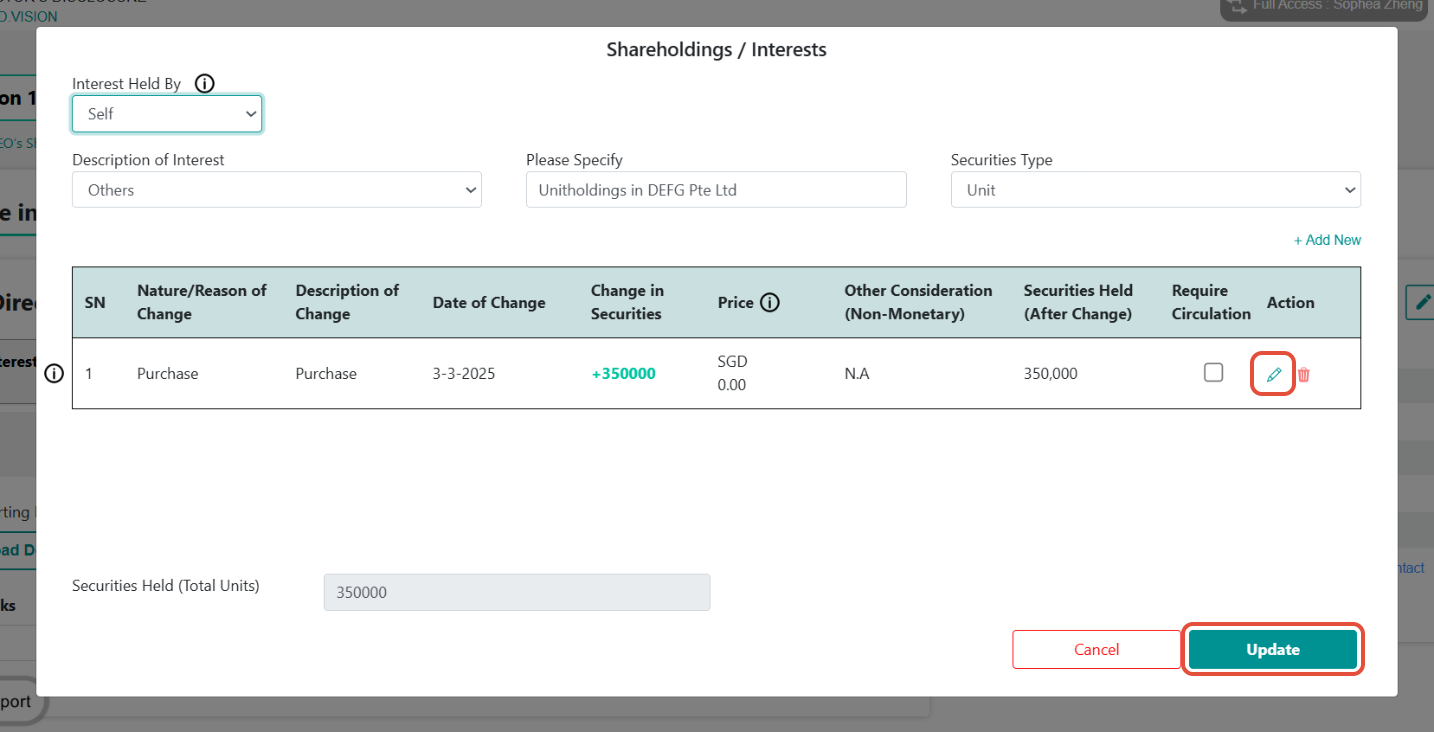 6) On the Shareholdings / Interests pop-up window, click on the Edit icon to change the existing record. Then, click on the Update button.