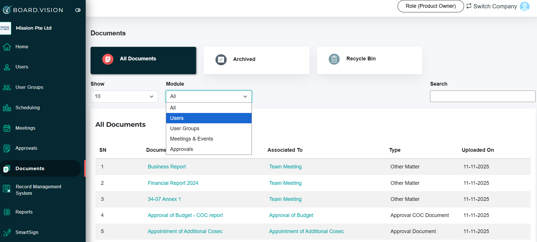 All Documents (includes User files, User Group files, Meeting files, and Approval files), Archived (includes Meeting and Approval reports), and Recycle Bin (includes deleted Meeting and Approval reports).