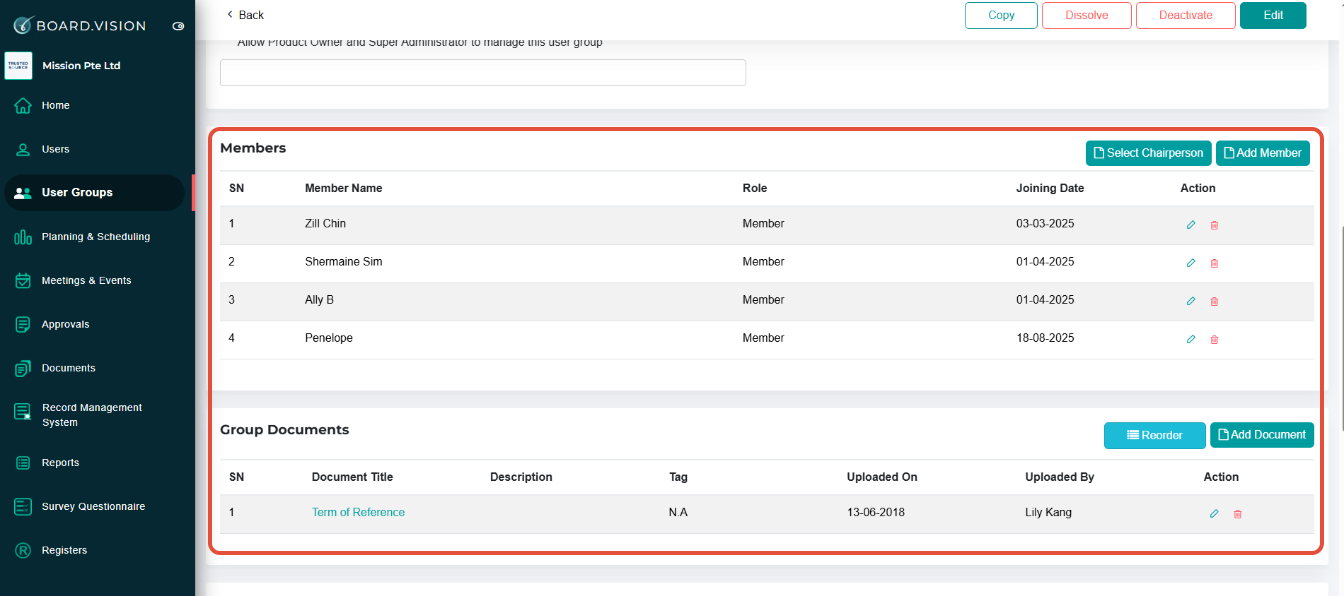 Scroll down to "Members" to view the list of users added as members. You can find the group-related documents under "Group Documents".