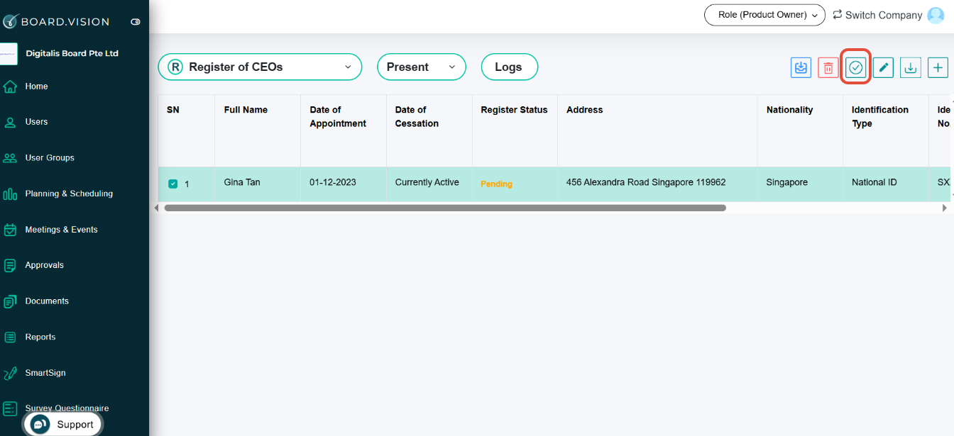 5) Once you have clicked on Add to Register, the CEO’s appointment and details will be added to the Register with a Pending status.