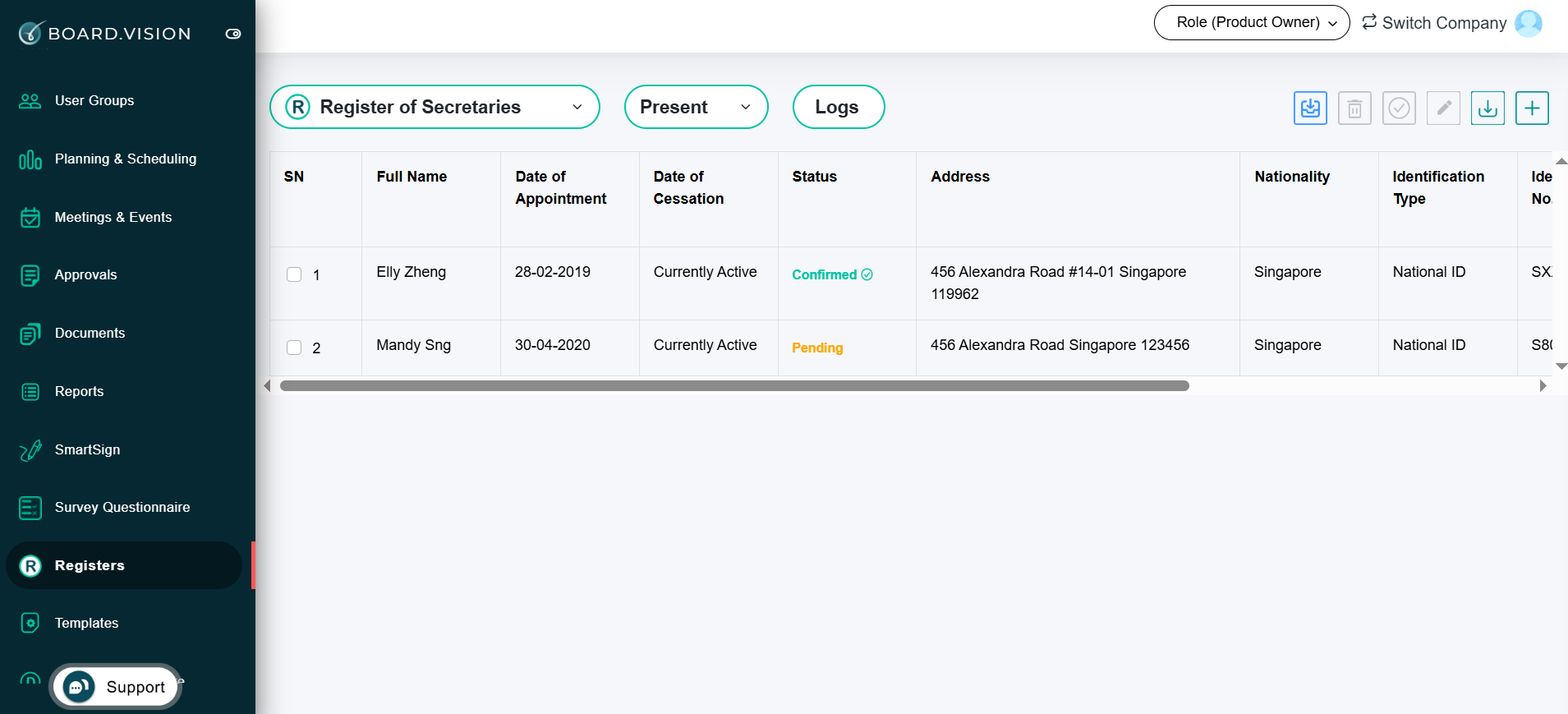 2) Once you are logged in, navigate to Registers from the left menu. Proceed to the Register of Secretaries listing page, and click on the + button at the top right.