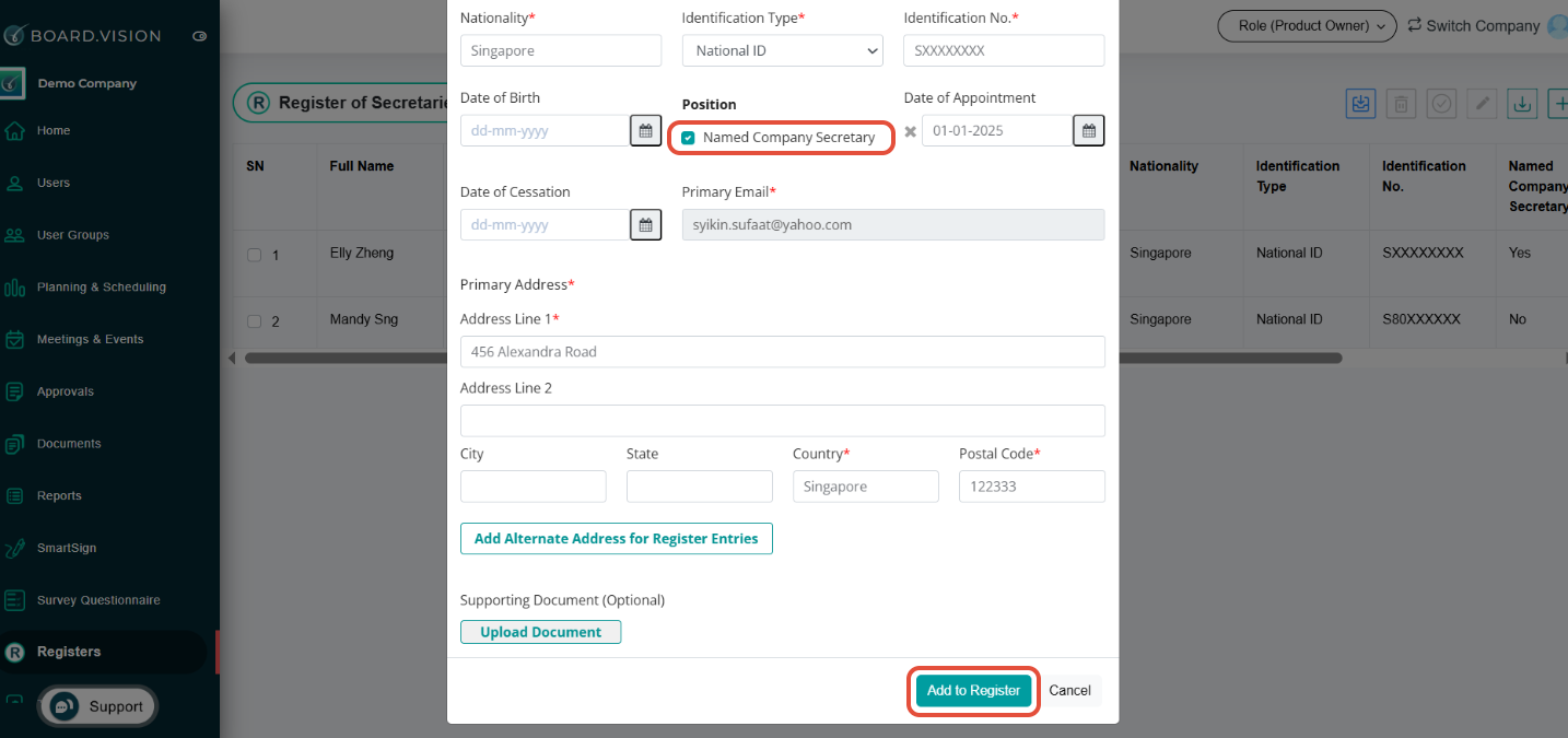 4) Fill in the required fields (Nationality, ID Type, ID Number, Appointment Date, and Address) and select the Named Company Secretary checkbox. Then, click on Add to Register.