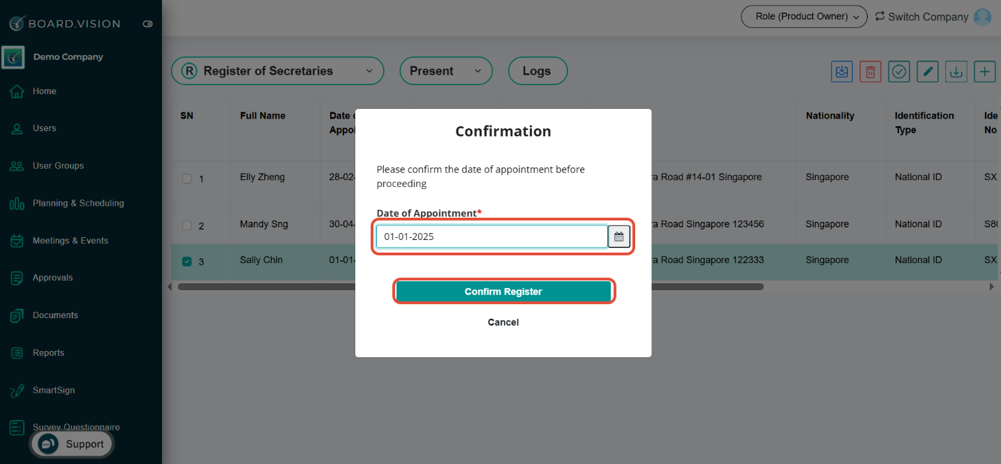 2) On the "Confirmation" pop-up window, enter the Date of Appointment and click on the Confirm Register button.
