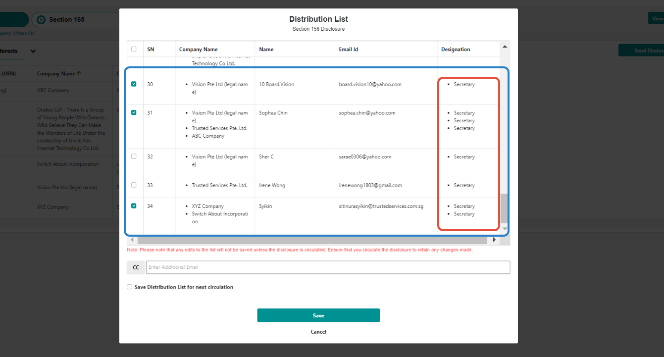 When circulating Directors’ Disclosures (Sections 156 and 165), you may notice that the Company Secretary’s name or email is not reflected in the Distribution List on the disclosure form.