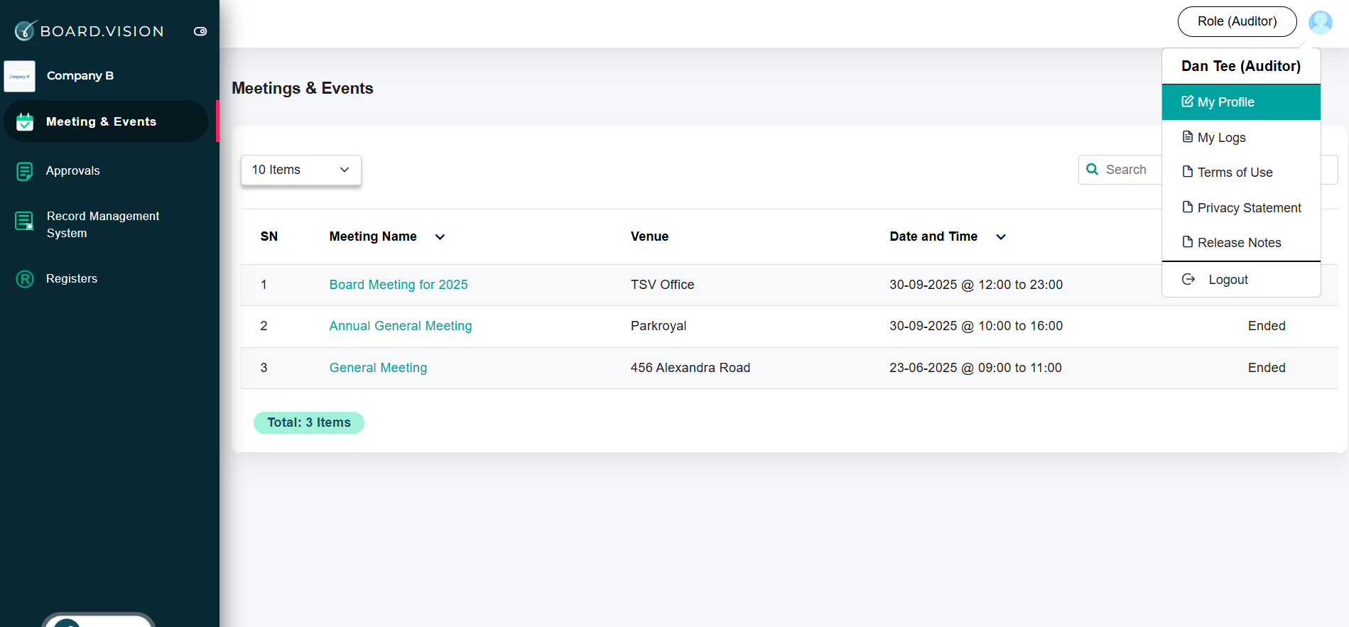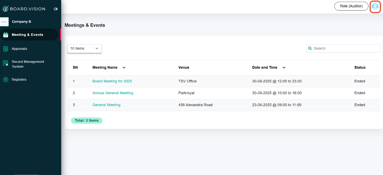 2) You will land on Meetings & Events. Click on Your Profile Picture at the top right of your screen.