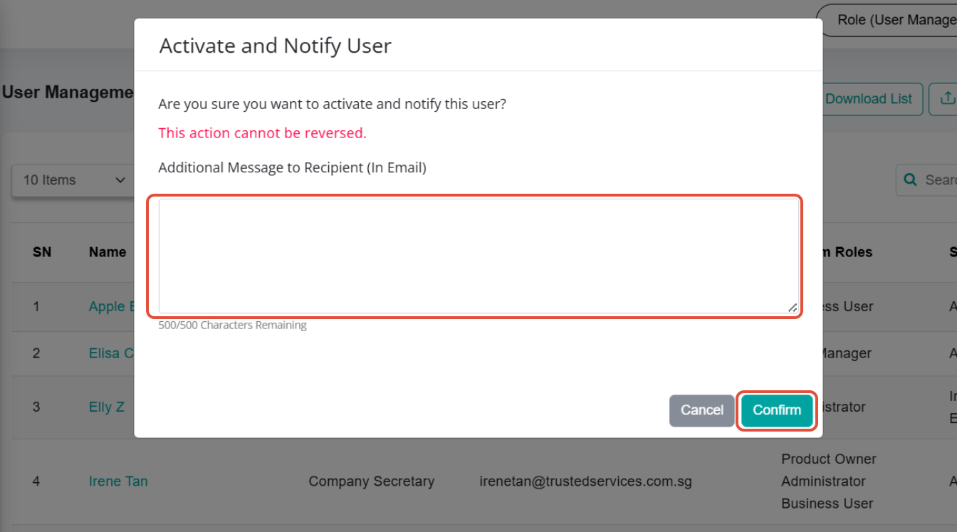 4) On the Activate and Notify User pop-up window, type in your message within the Additional Message to Recipient (In Email) box if required. Then, click on the Confirm button.