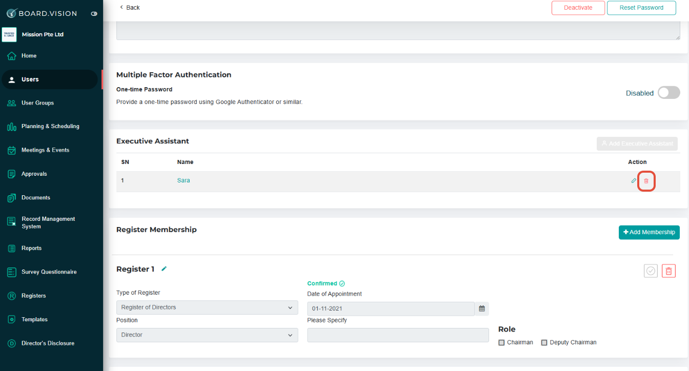 3) In the View User page, scroll down to the Executive Assistant section and click on the Delete icon.