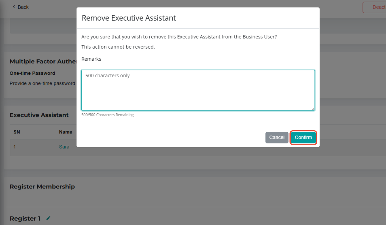 4) On the "Remove Executive Assistant" pop-up window, click on Confirm.