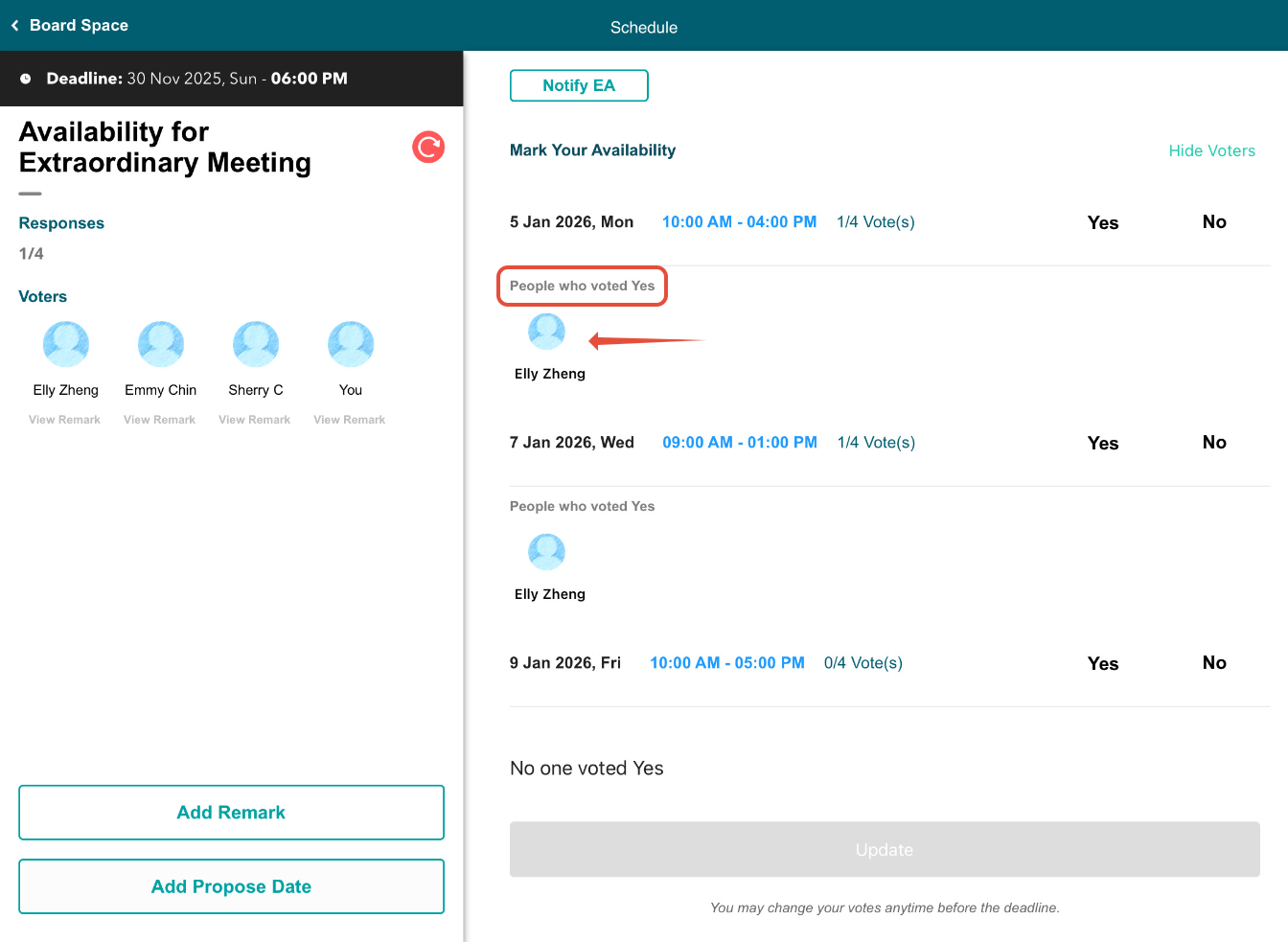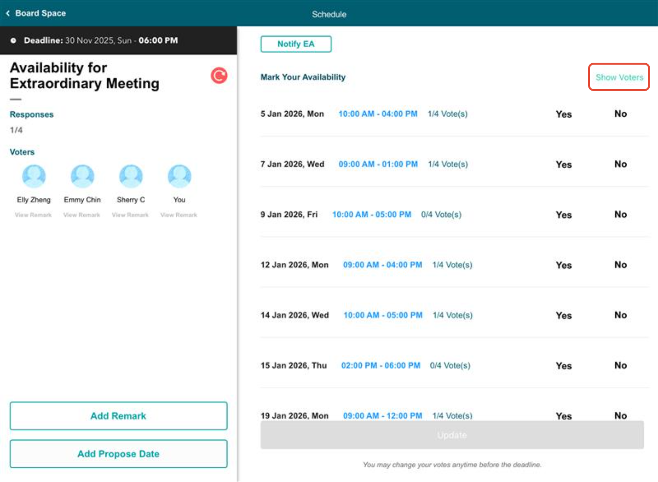 4) Once you have tapped on Show Voters, you will be able to view the participants who had voted a Yes to the proposed dates.