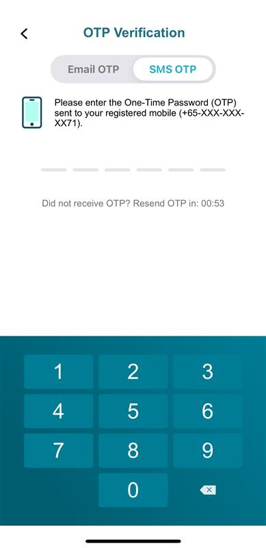 Once you have tapped on Forgot PIN, you will be prompted to enter a 6-digit OTP that has been sent to your registered mobile phone number via SMS. Alternatively, you can use Email OTP.