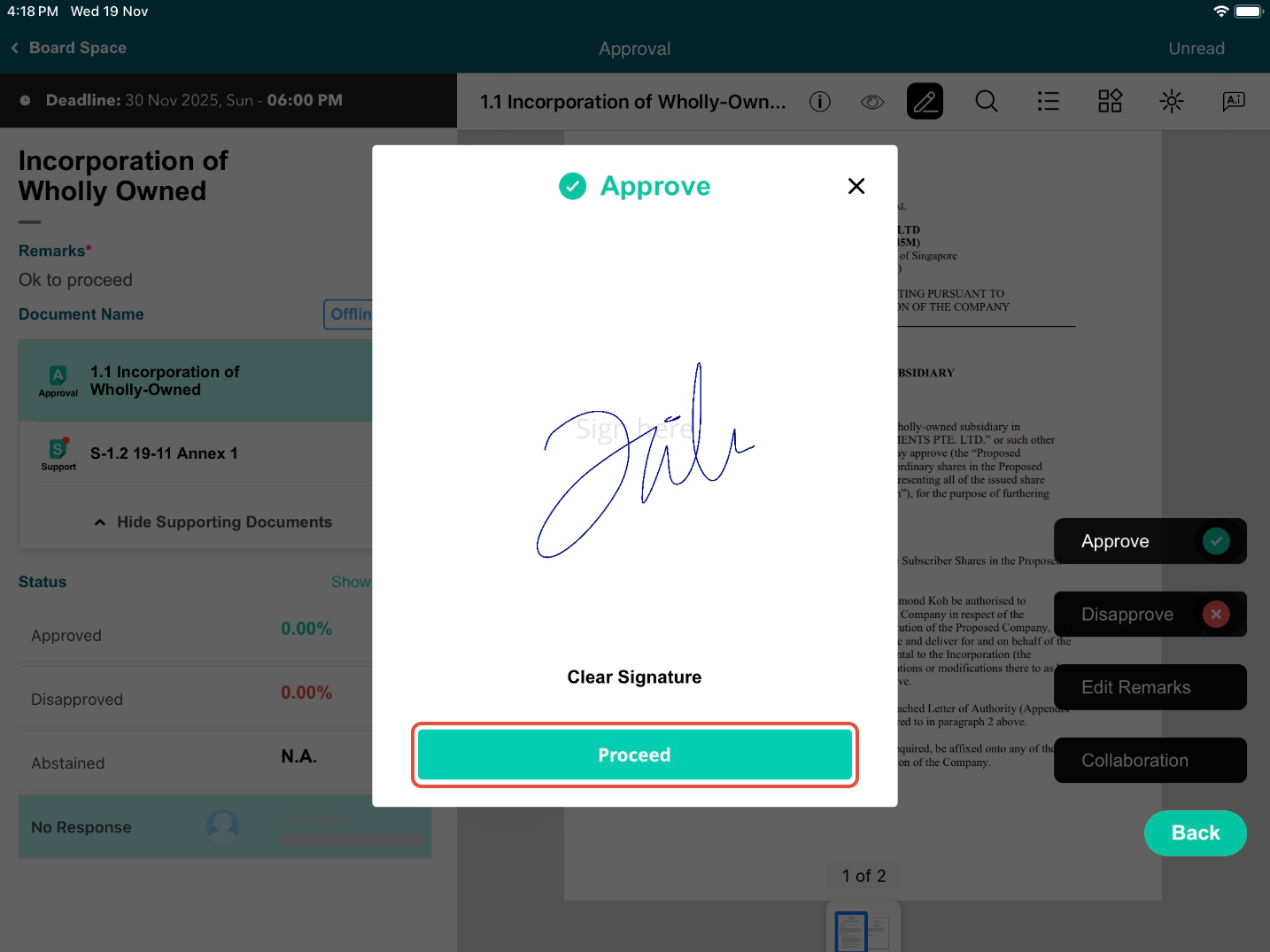 8) Following your response selection, a screen will appear, reflecting your chosen response and signature. Tap on Proceed to continue.