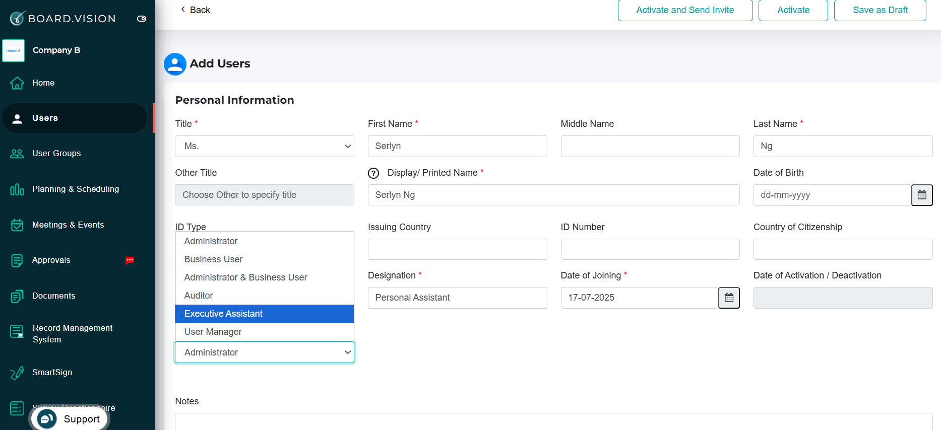 3) In the Add User page, enter the mandatory fields and select Executive Assistant under the System Roles dropdown.