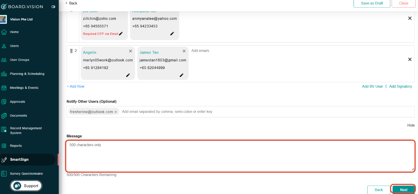 If you want to set a signing sequence, click on Add More Row to place signatories in separate boxes (e.g., Box 1 and Box 2).