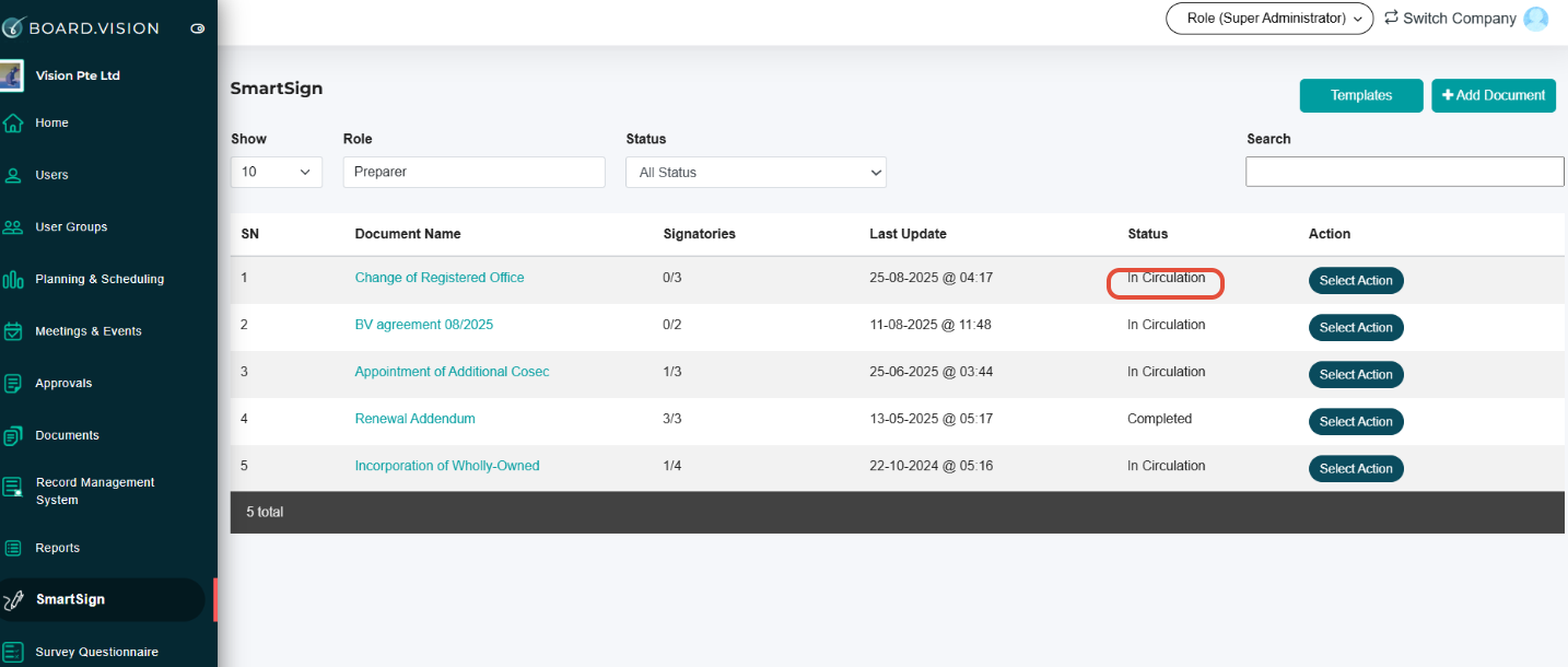 16) Once the document has been sent successfully, the status will be updated to "In Circulation".