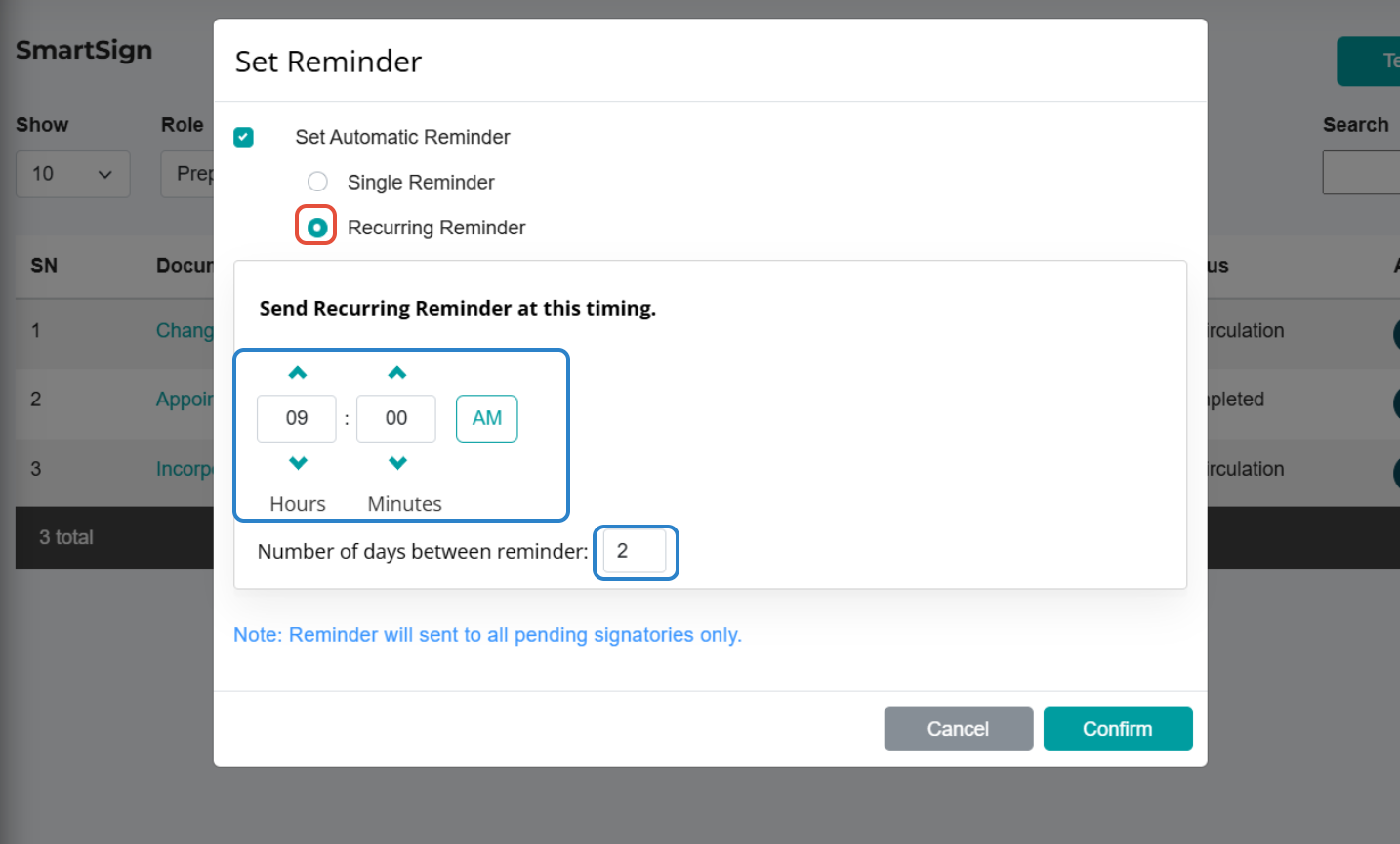 Note: The reminder will be sent on the date and time set, only to pending signatories.