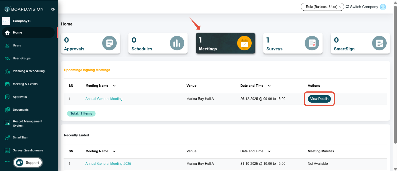 2) Once you have logged in, select the Meetings filter on your Home screen and click on View Details.