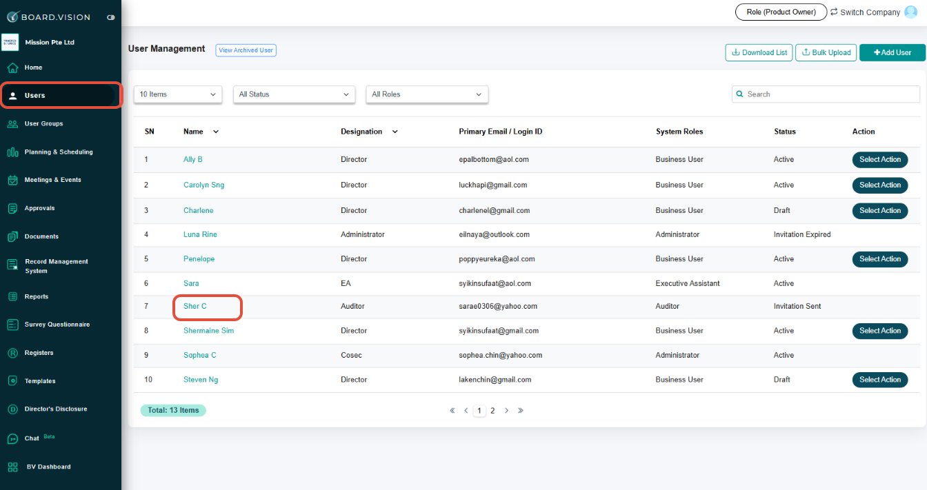2) From the left menu, go to Users. Then, click on the Auditor's Name.