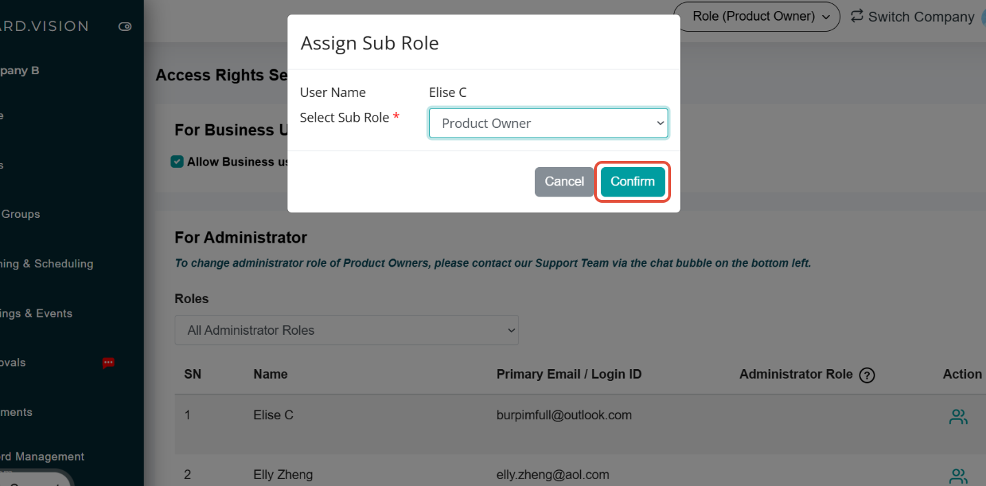 4) On the "Assign Sub Role" pop-up screen, select the role you wish to assign to the Administrator and click on Confirm to save the update.