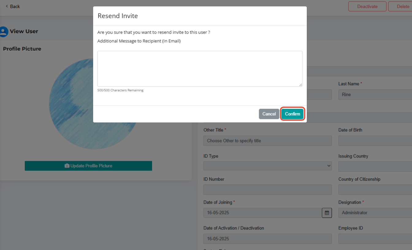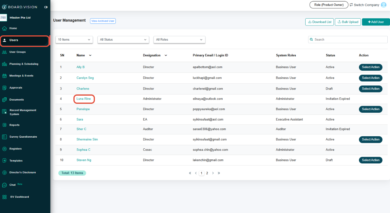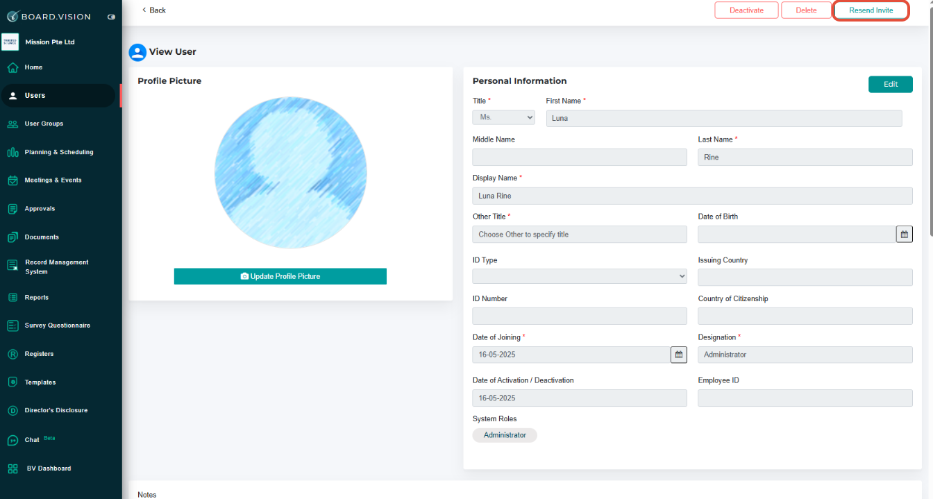Important Note: Upon resending the invite to the user on Board.Vision, he/she will be receiving an email from notifications@board.vision with an activation link to set his/her password. The user's account activation link will expire after 10 days. Administrators will be able to resend the invitation via the user's profile.