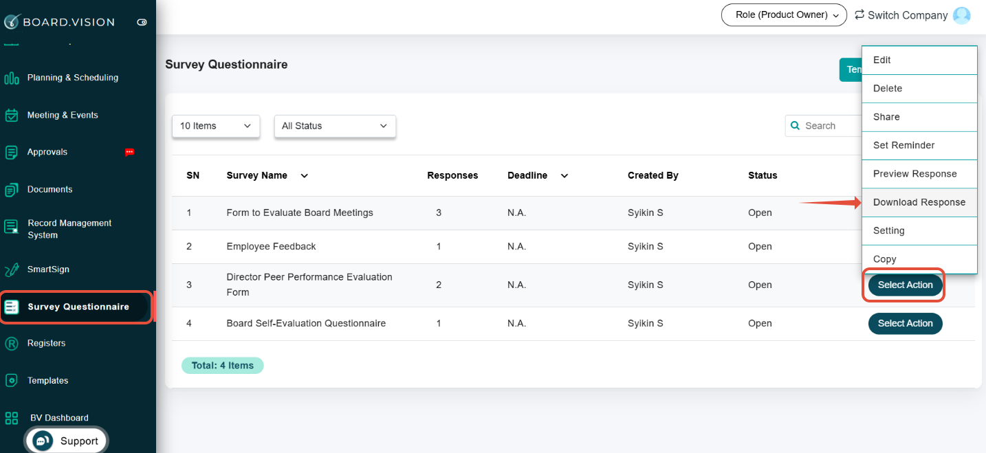 2) From the left navigation menu, go to Survey Questionnaire. Click on Select Action and select Download Response.