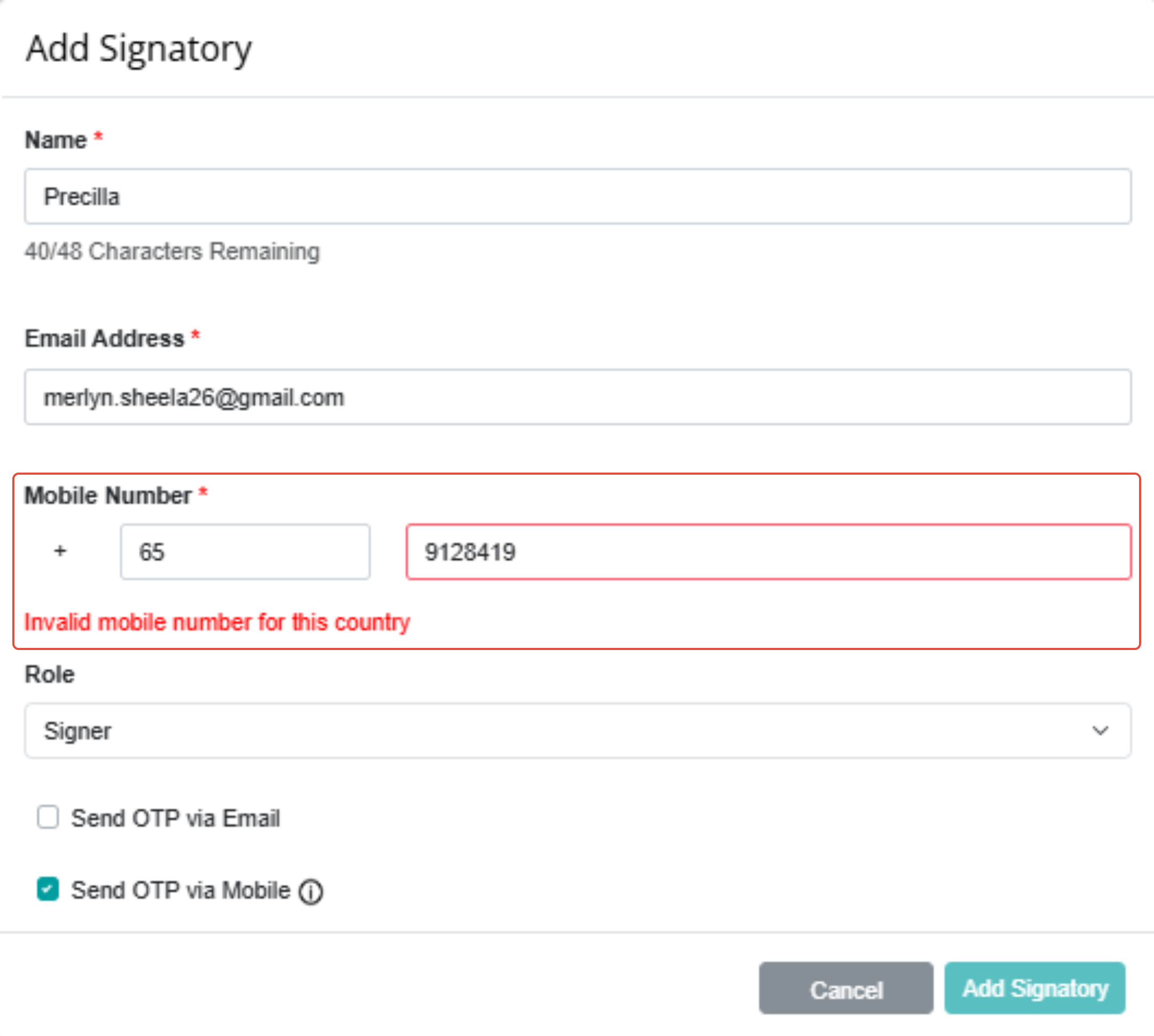 With this enhancement, Administrators will be able to immediately identify whether the entered mobile number is valid. This helps prevent one-time (OTP) delivery issues and reduces delays during the signing process.