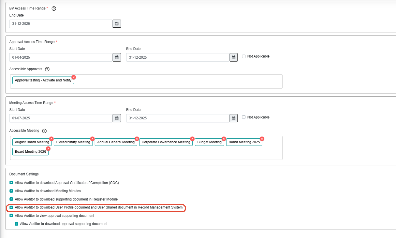 “Allow Auditor to download User Profile documents and User Shared documents in the Record Management System.”