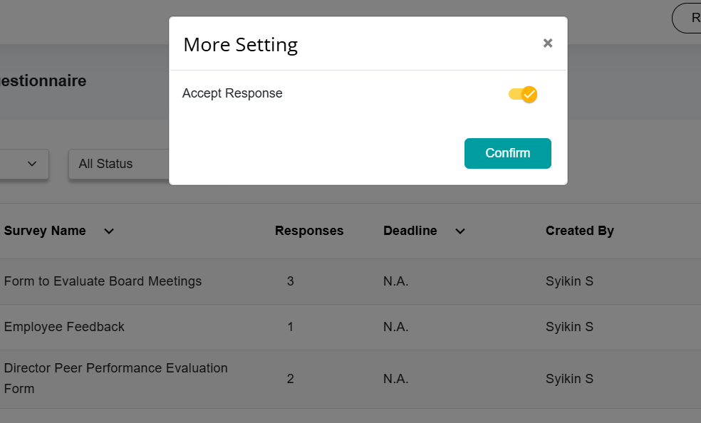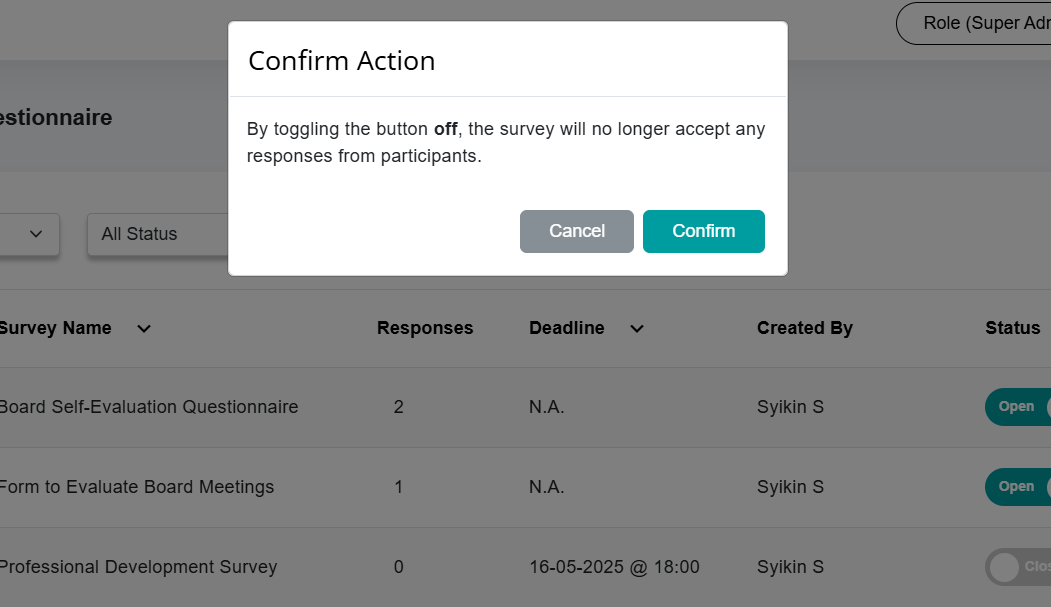 Current Design - The survey status is now shown as an Open / Close toggle on the listing page, enabling Surveyors to update the status instantly, with a confirmation pop-up to confirm the action. | ![]() ![]() |