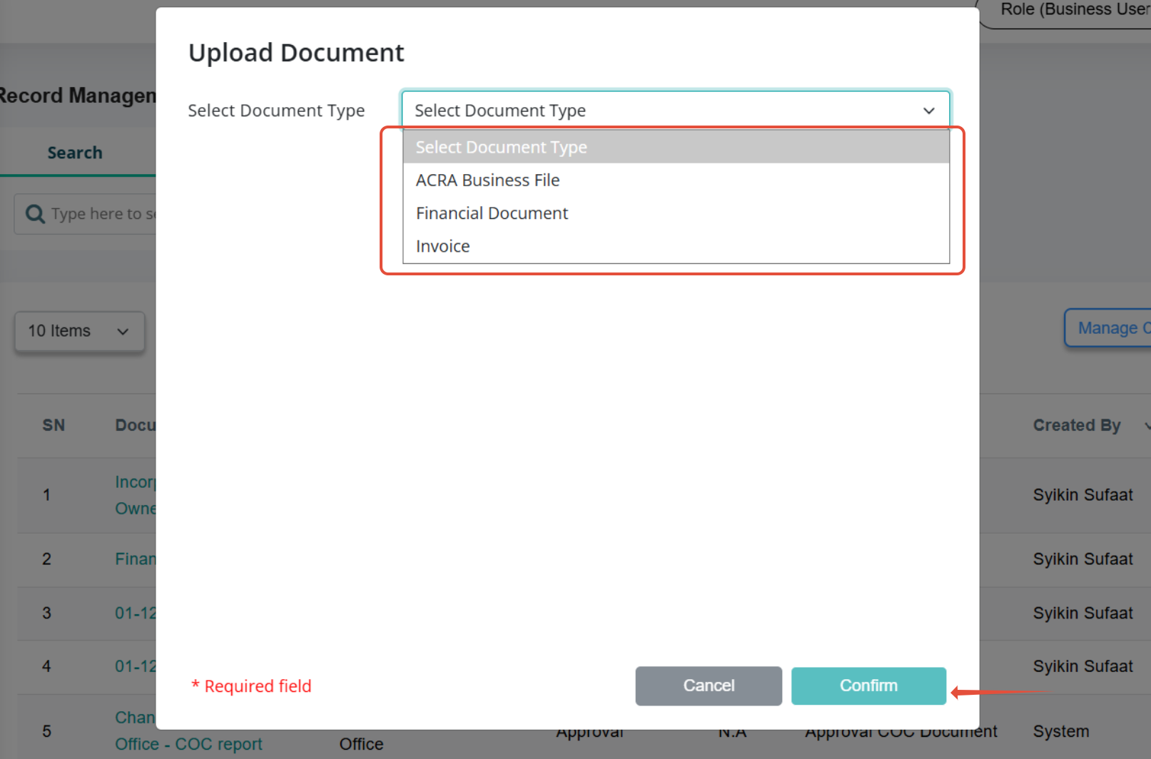 a) First, choose the Document Type from the dropdown and click on Confirm.
