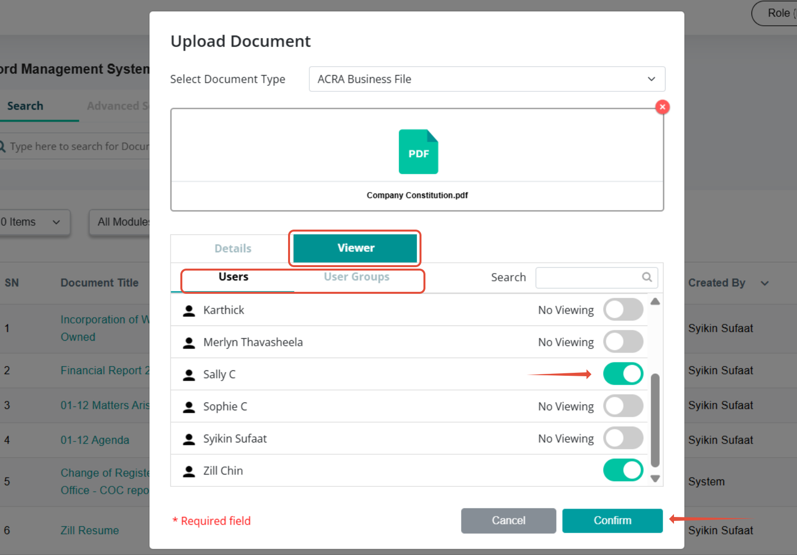 d) To update access settings, go to the "Viewers" tab and select the Users or User Groups you wish to allow to view the uploaded document.