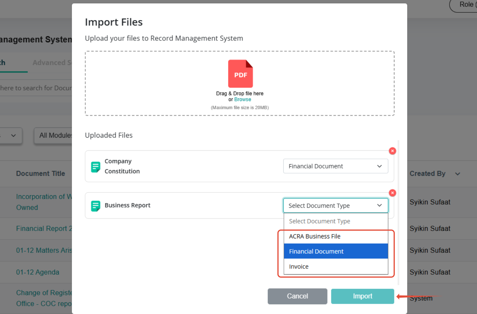 b) Choose the appropriate Document Type and click Import.