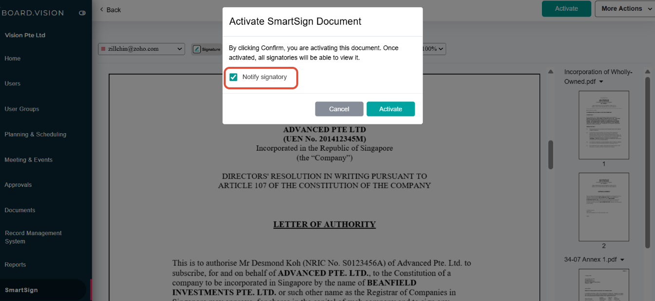Administrators can now activate a SmartSign document with or without notifying the signatory. When clicking the Activate button, a new confirmation pop-up is displayed, allowing them to choose whether a notification should be sent.