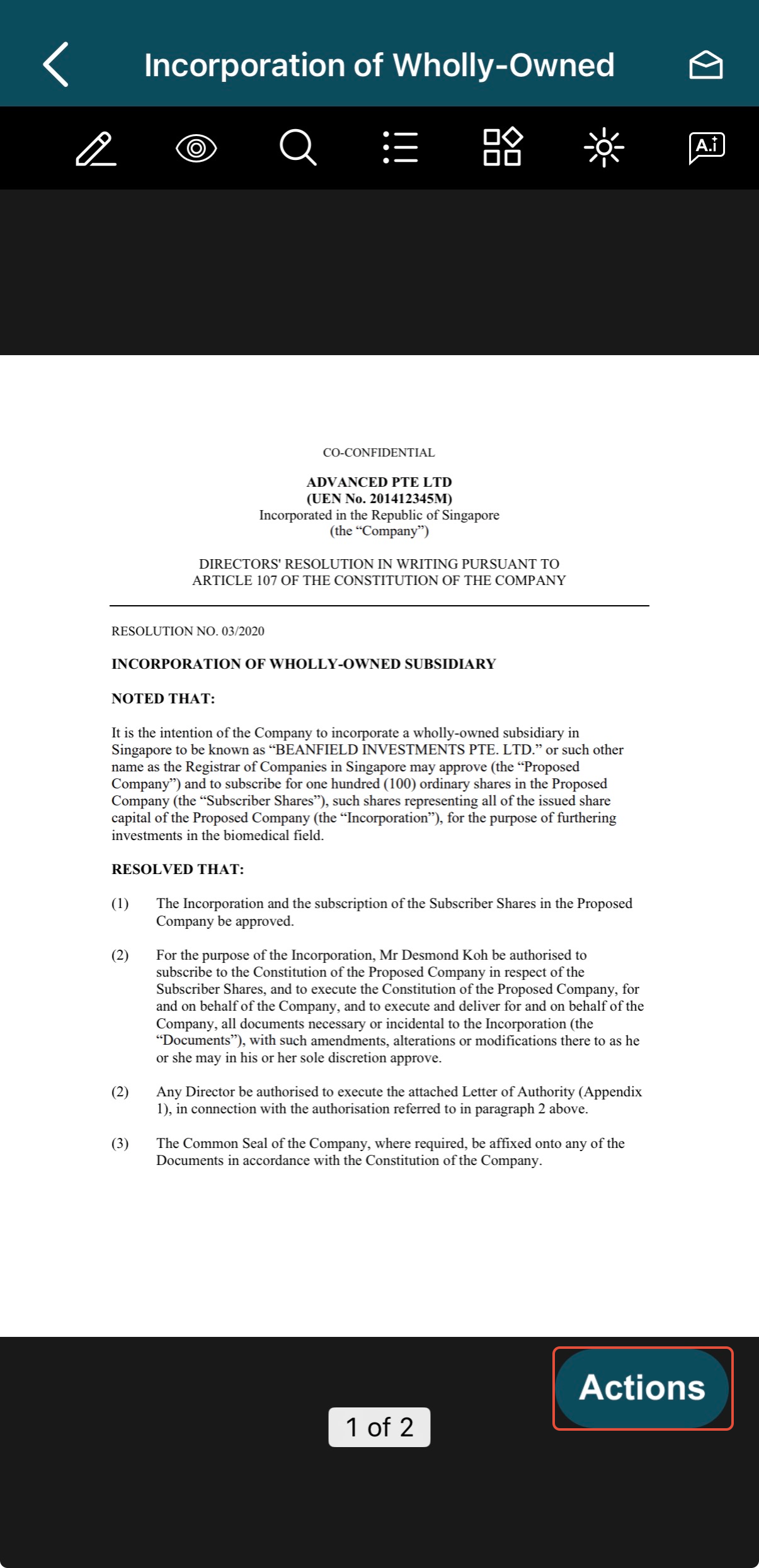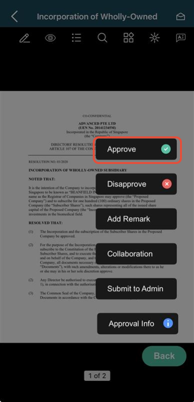 1) Open an Approval document and tap on Actions.