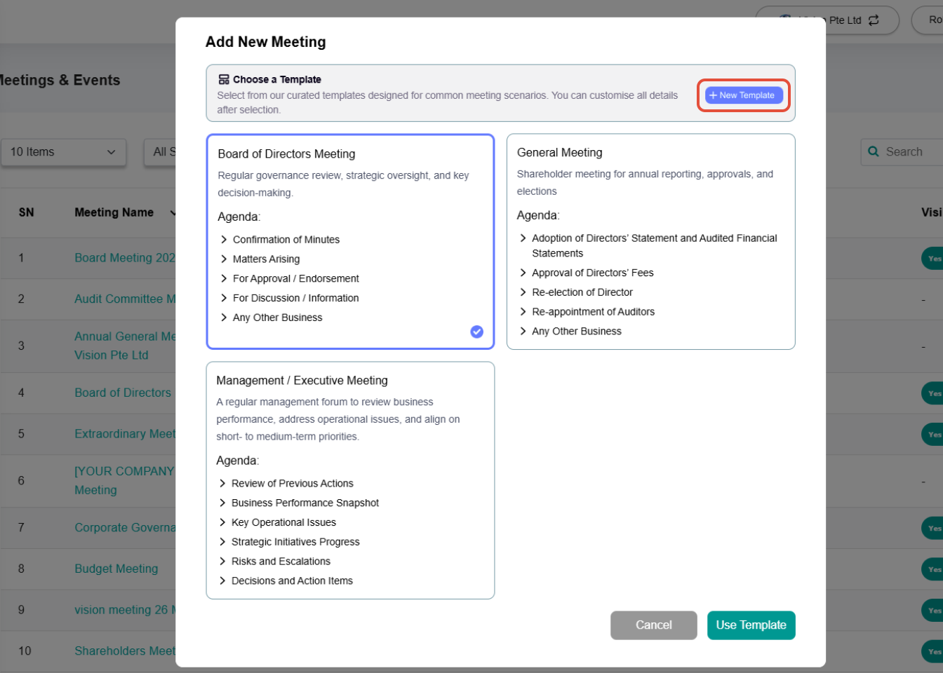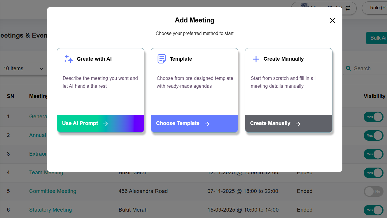 1) Add Meeting Pop-Up Upon clicking Add Meeting, Administrators will see: a) Create with AI Describe the meeting you want and let AI handle the rest. b) Template Choose from pre-designed templates with ready-made agendas. c) Create Manually Start from scratch and fill in all meeting details manually. | |