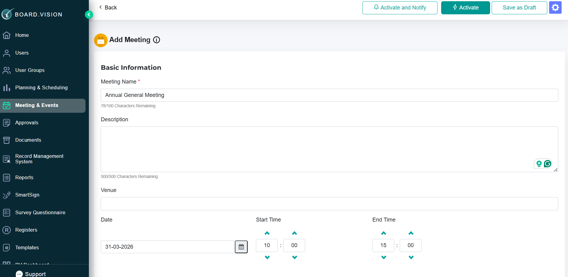 | 4) If Create Manually is selected, Administrators will be redirected to the Add Meeting page to create the meeting from scratch. | ![]() |