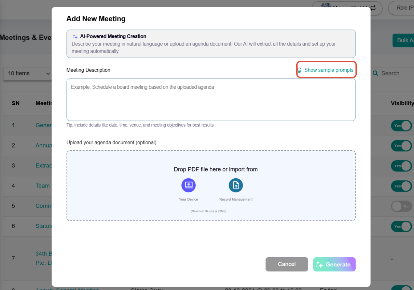Administrators may also click “Show sample prompts” to select a pre-filled example, which will automatically populate the meeting description field. After clicking Generate, the system will automatically create the meeting and generate a structured agenda. If an agenda document is uploaded, AI will use the document content to structure the agenda items accordingly. (The uploaded document is used for meeting agenda generation and is not automatically attached as a supporting document to individual agenda items.) | ![]() |