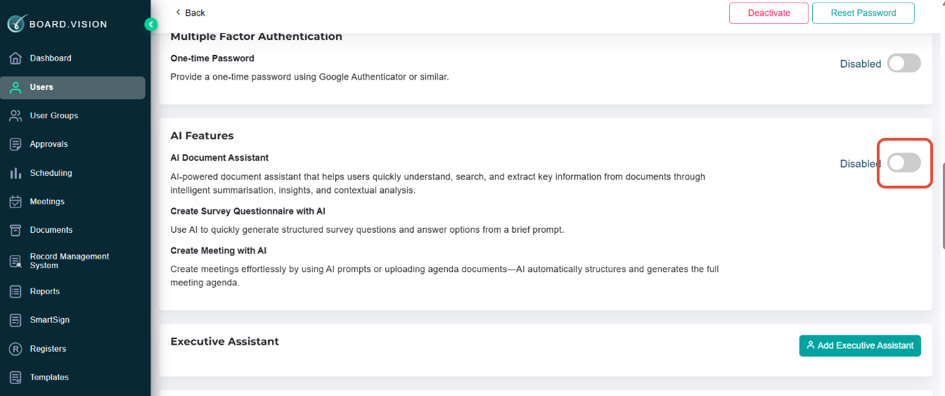 To disable/enable the AI Feature for a User:
